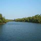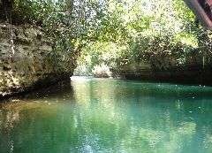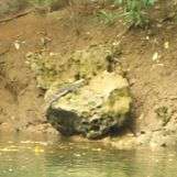 Leider verwackelt, aber hier ist, wer genau hinschaut ein kleines Flusskrokodil zu sehen. Im Fluss zum Green Canyon.